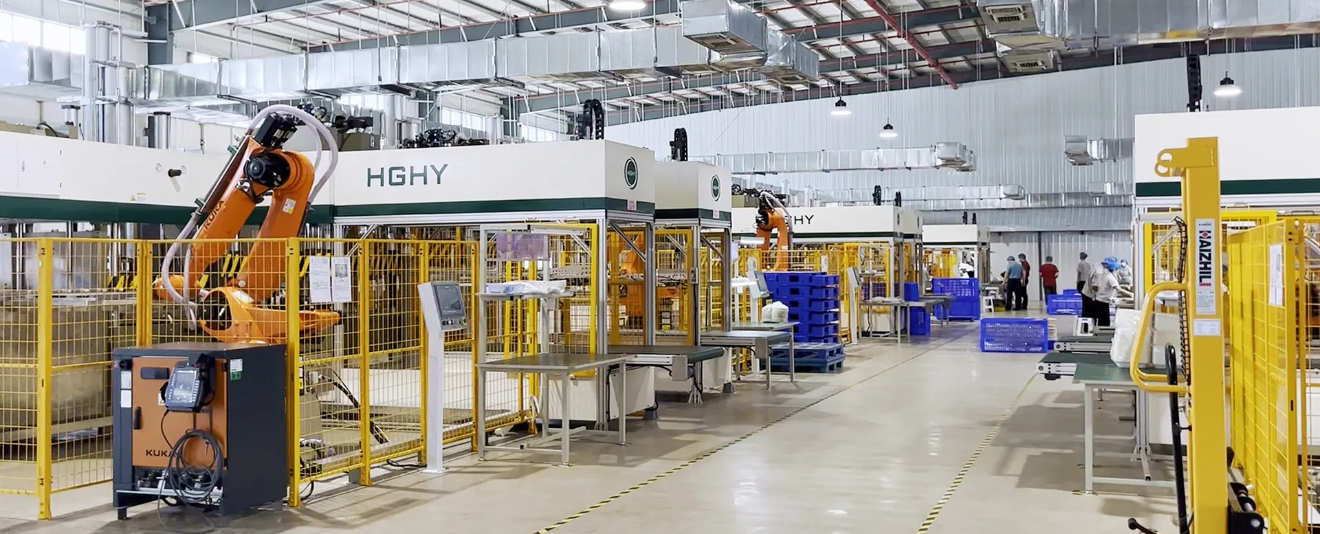 高效自动化:全球知名机器人品牌,利用机器人连接各道工序,实现全自动化生产。设备布局合理,模具更换便捷;开放式设计,后期维护简单。特殊设计确保成型均匀,热压一次完成。